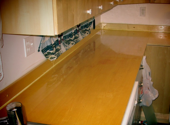I ran them through the table saw to cut them to size, and cut off backers. Then, I used them as counter tops that actually matched the cabinets. This would hold me until the real counter tops could be delivered and installed and I would just have to reinstall the sink afterwards. However, when we put them in, they looked so nice that we held off on ordering the proper counter tops. That was in the spring of 2005, and they have been in place since then.