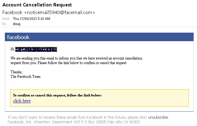 “Wait!”, you say. “I didn’t ask to delete my account,” although like most sensible Facebook users, this has crossed your mind on many occasions. You notice the instruction near the bottom, “To confirm or cancel this request, follow the link below.” Is this legitimate?