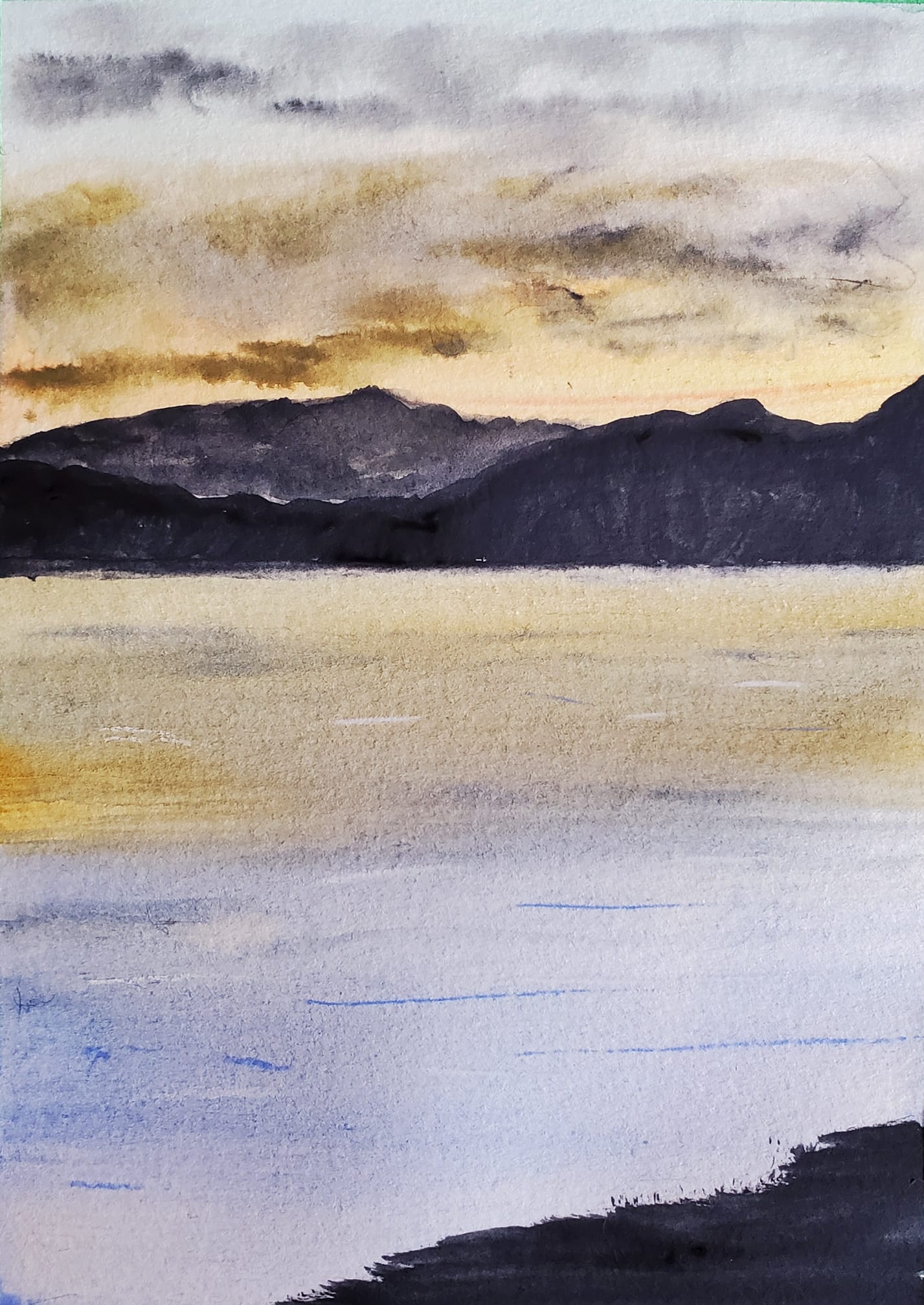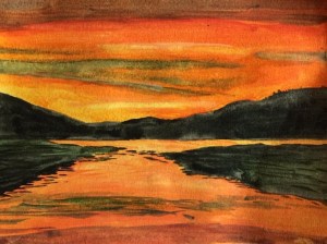 I was reminded of the first watercolour painting I did, which was a painting of a solstice sunset from Fox Lake campground in 2015. It turned out quite well for a first ever attempt, good enough that my grandson claimed it immediately. (I suggested he put it on his fridge…)