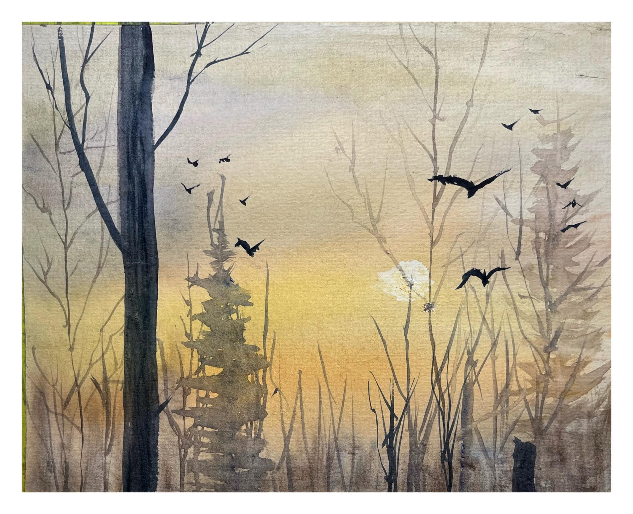 Flight of the ravens, watercolour on paper, 8×10 inches.