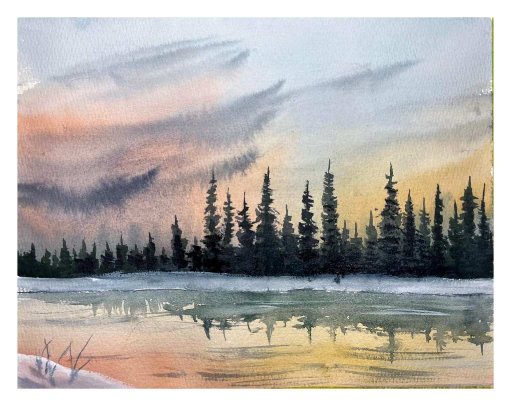 Day’s end, McIntyre Creek. Watercolour on paper, 8×10 in.