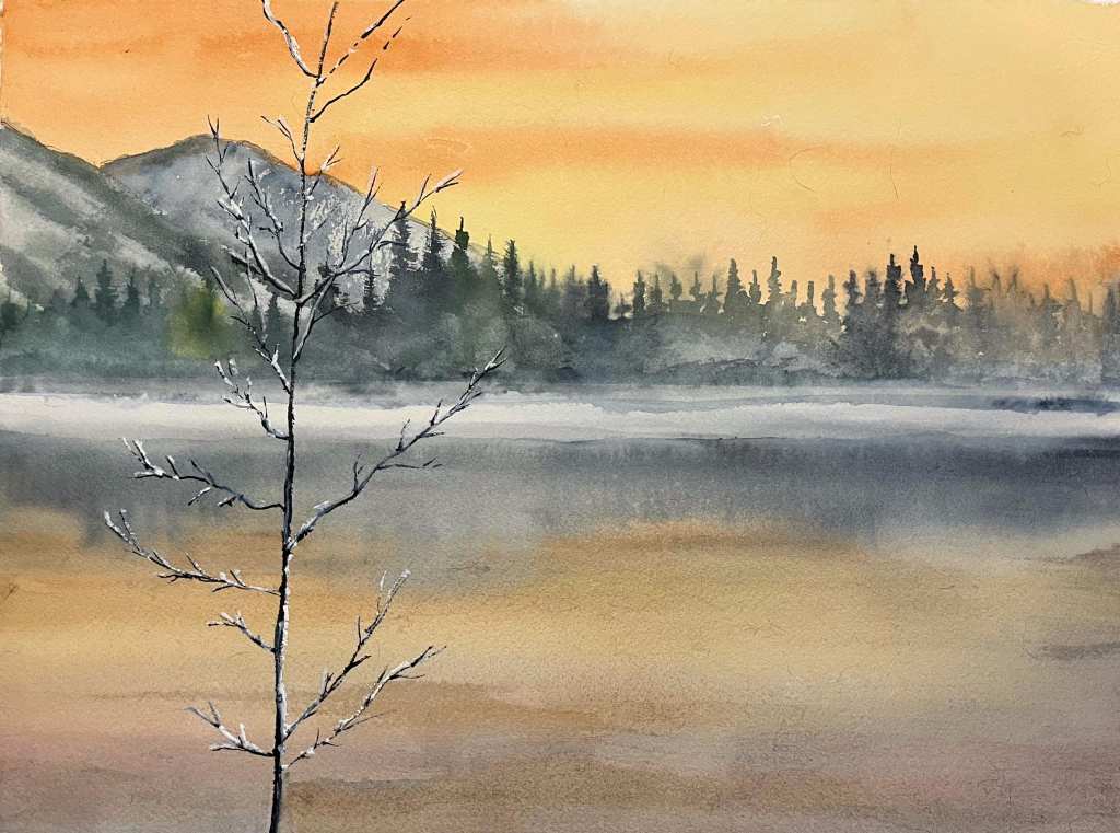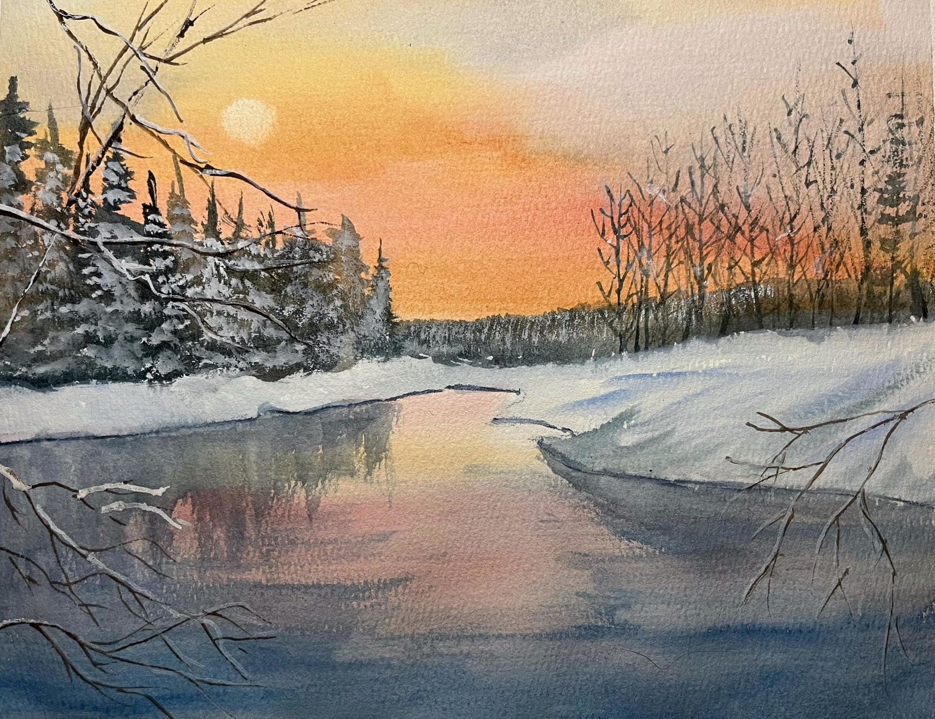 The last sunrise of 2023, Yukon River. Watercolour on paper, 11×15 inches. Private collection.