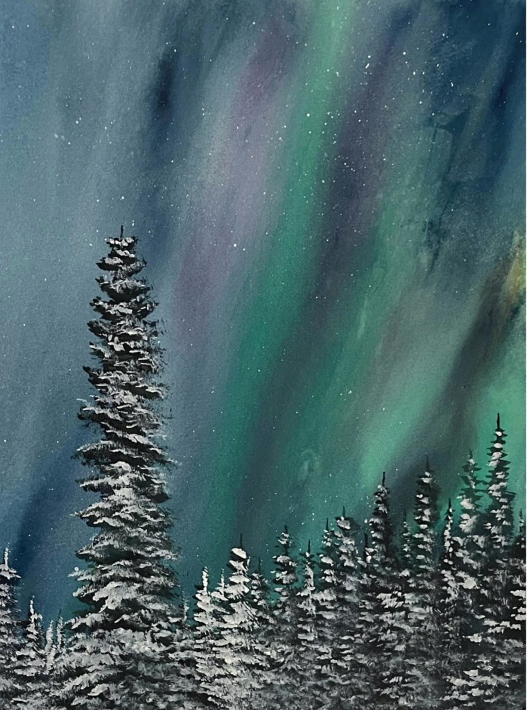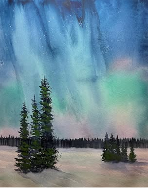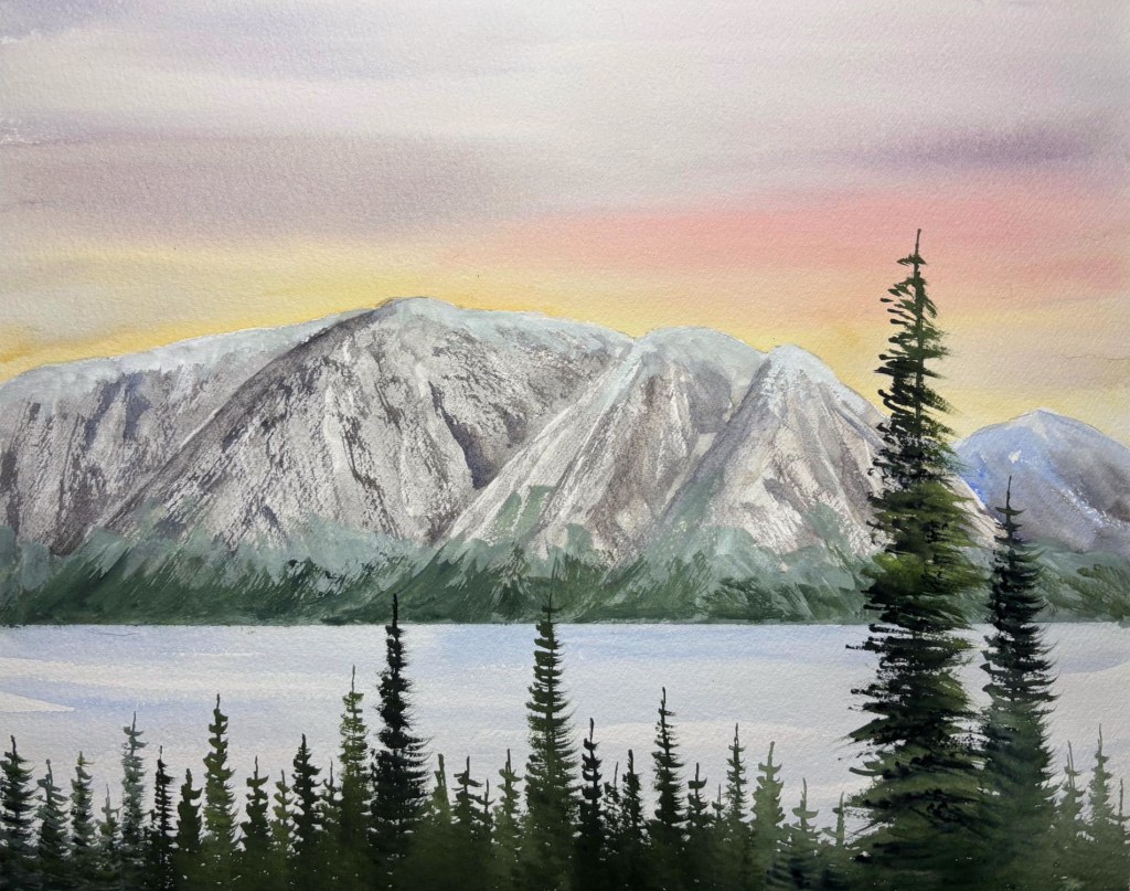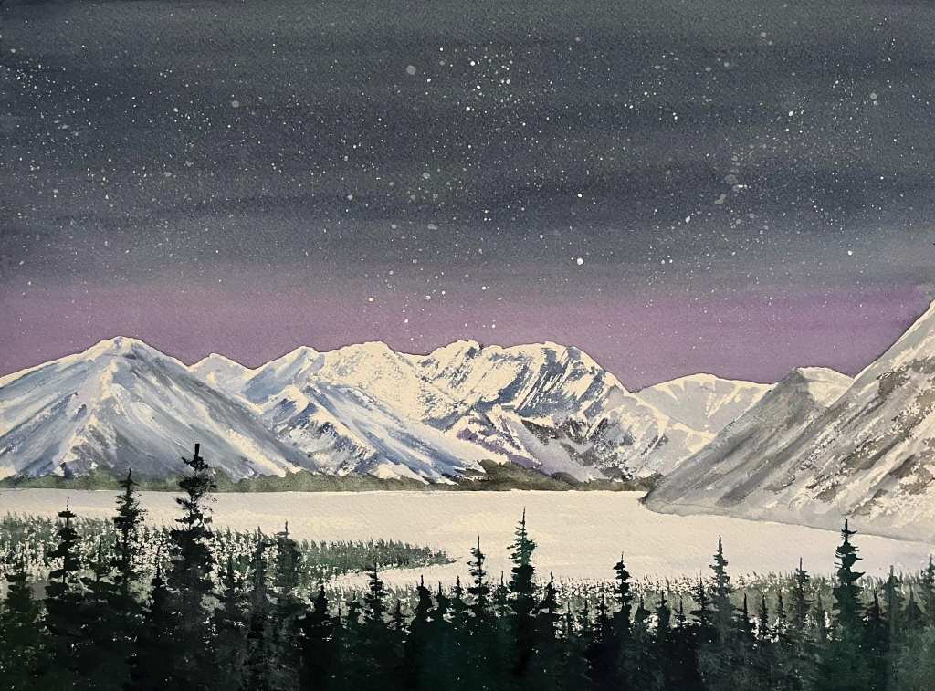 Starry night, Kathleen Lake. Watercolour on paper, 11×15 inches. Private collection.