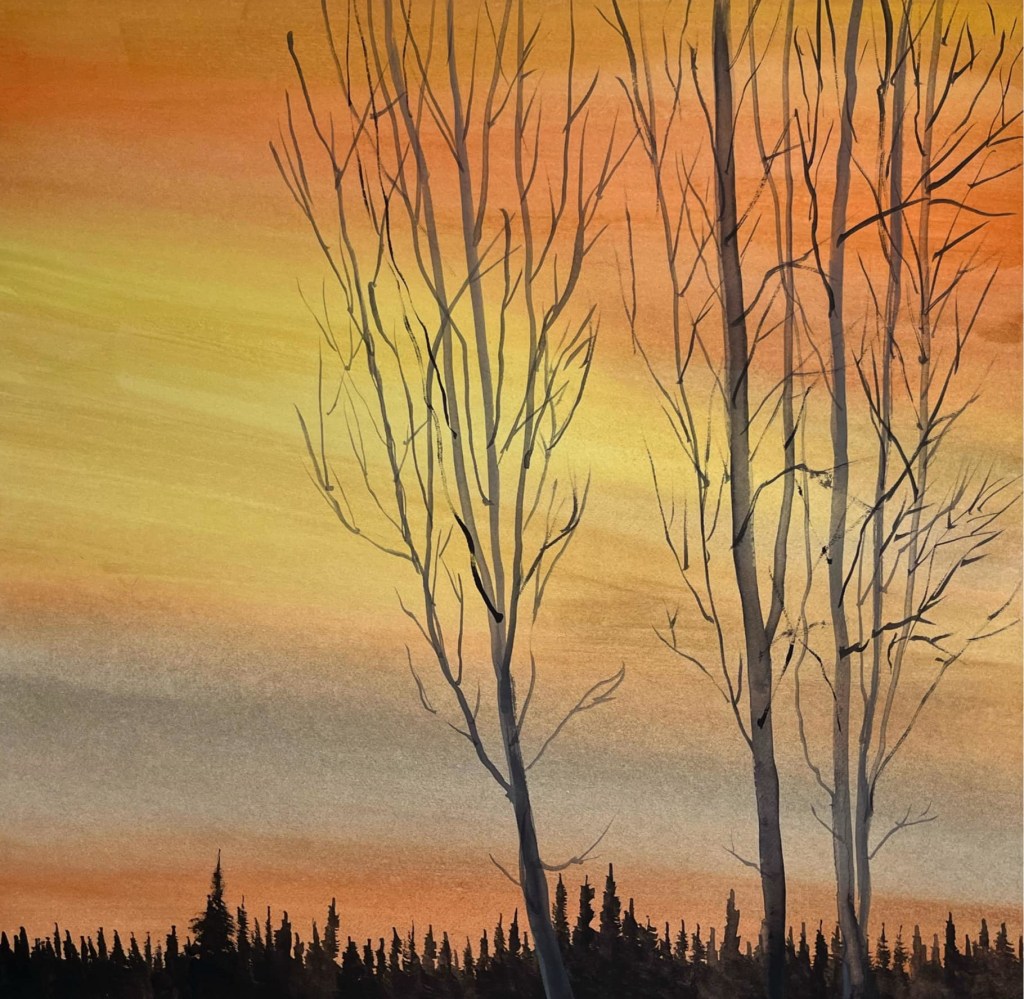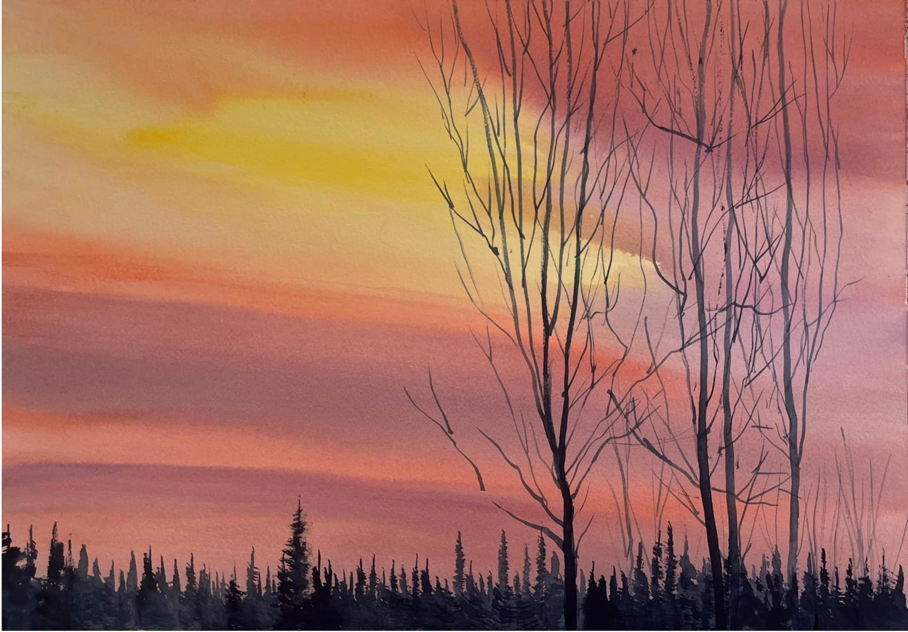 Sunset, Porter Creek. Watercolour on paper, 11×15 inches. Private collection.