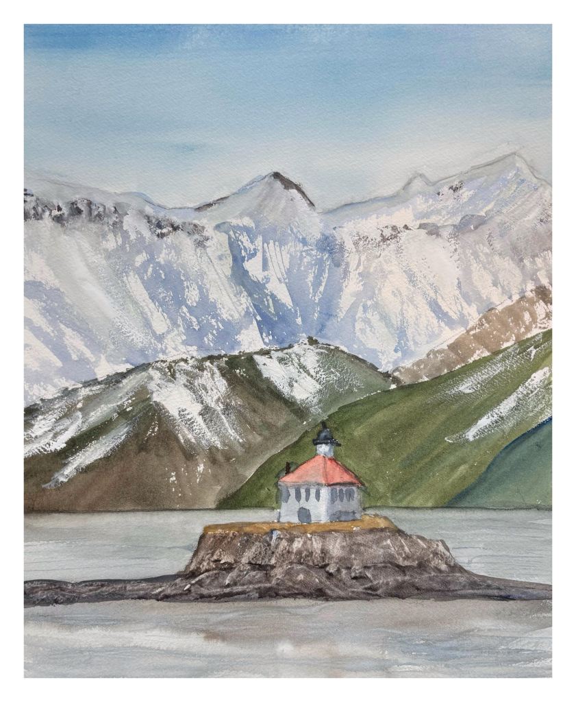 Eldred Rock Light, Lynn Canal, Alaska. Watercolour on paper, 11×14 inches.