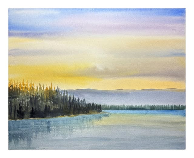 Morning calm, Teslin Lake. Watercolour on paper, 11×14 inches.