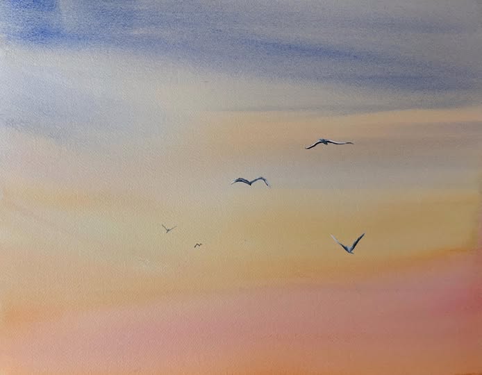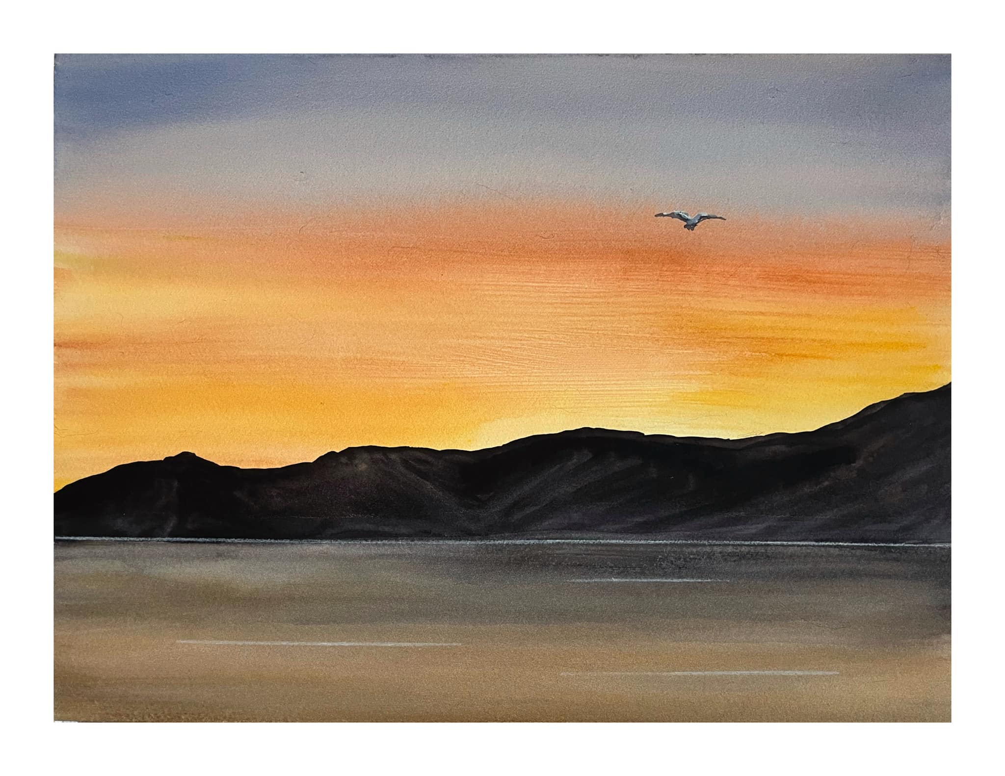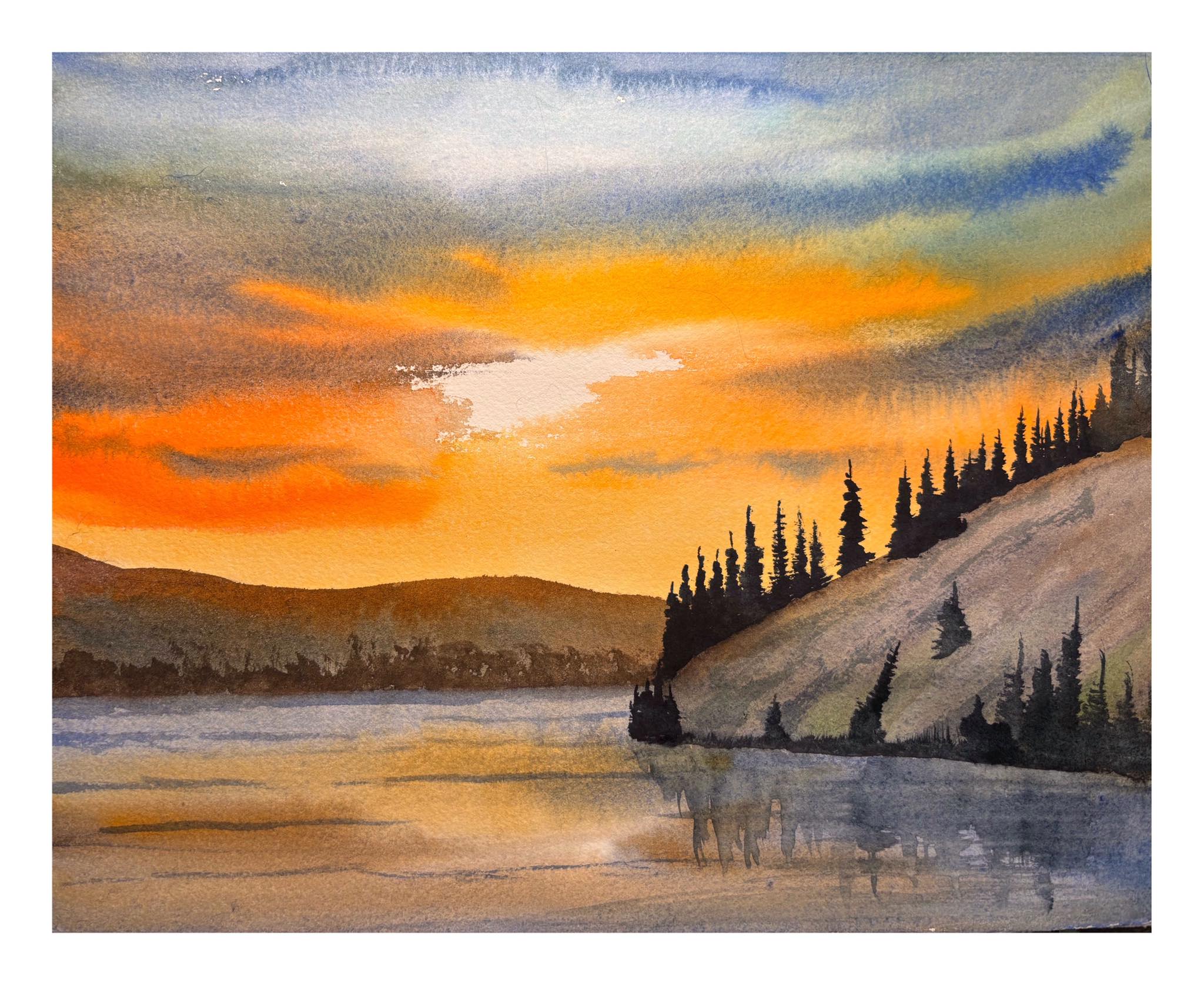 Sunset, Frenchman Lake. Watercolour on paper, 11×14 inches.