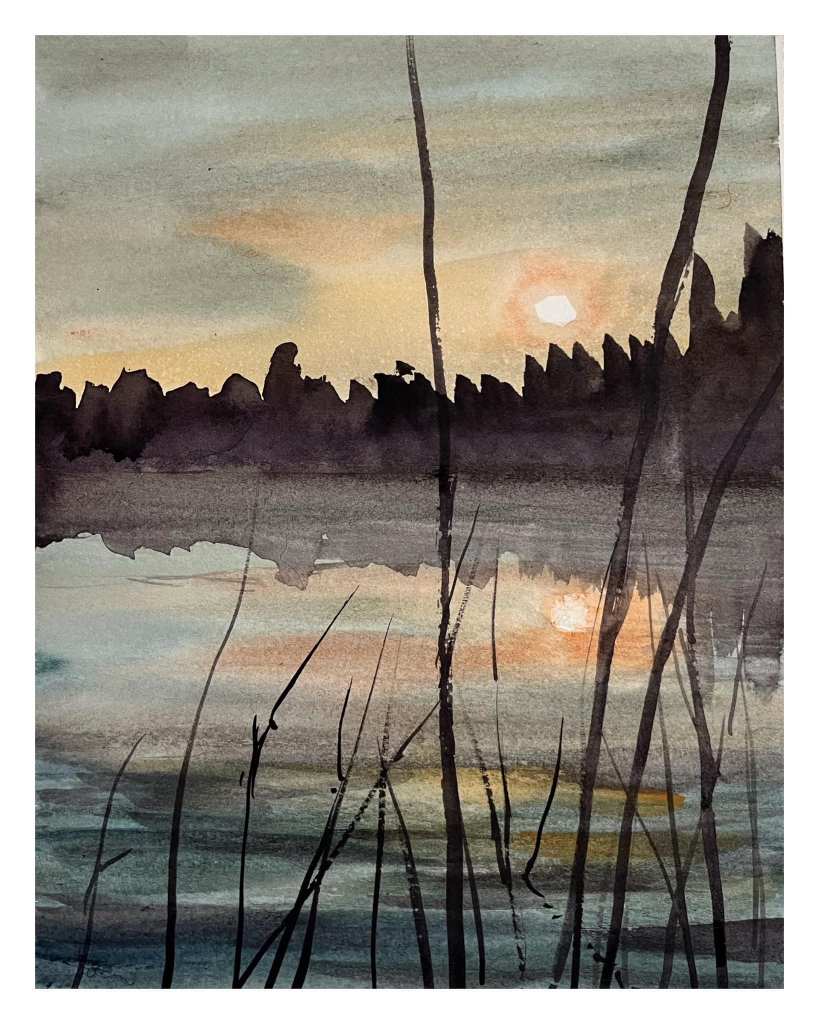 Sunset pond. Watercolour on paper, 8×10 inches.