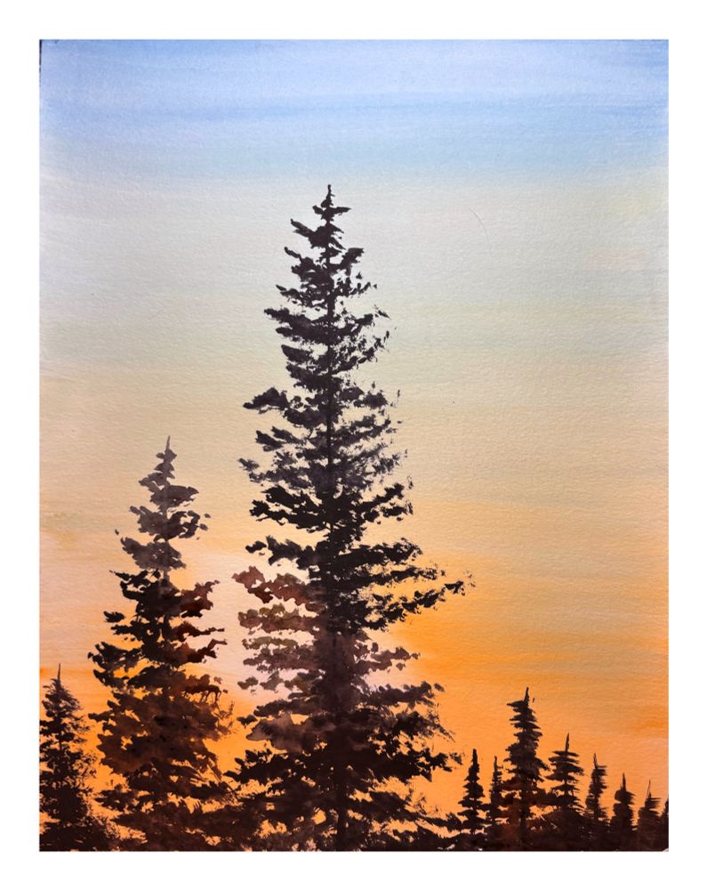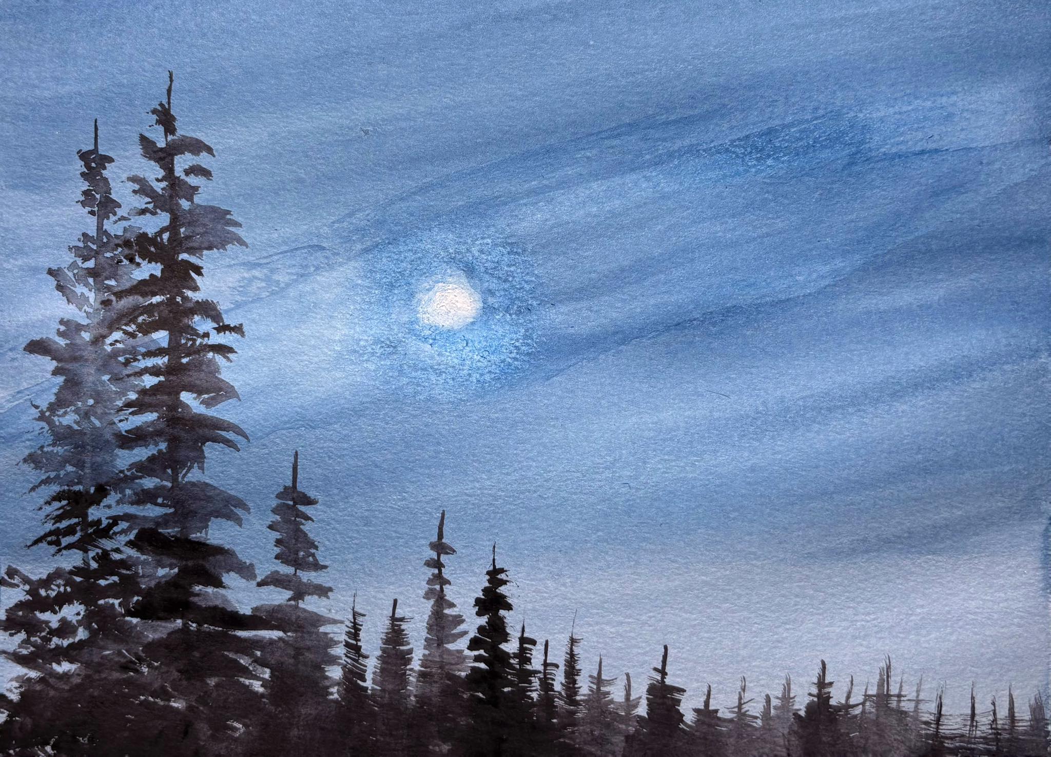 Night in the forest. Watercolour on paper, 8×10 inches.
