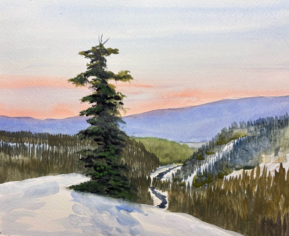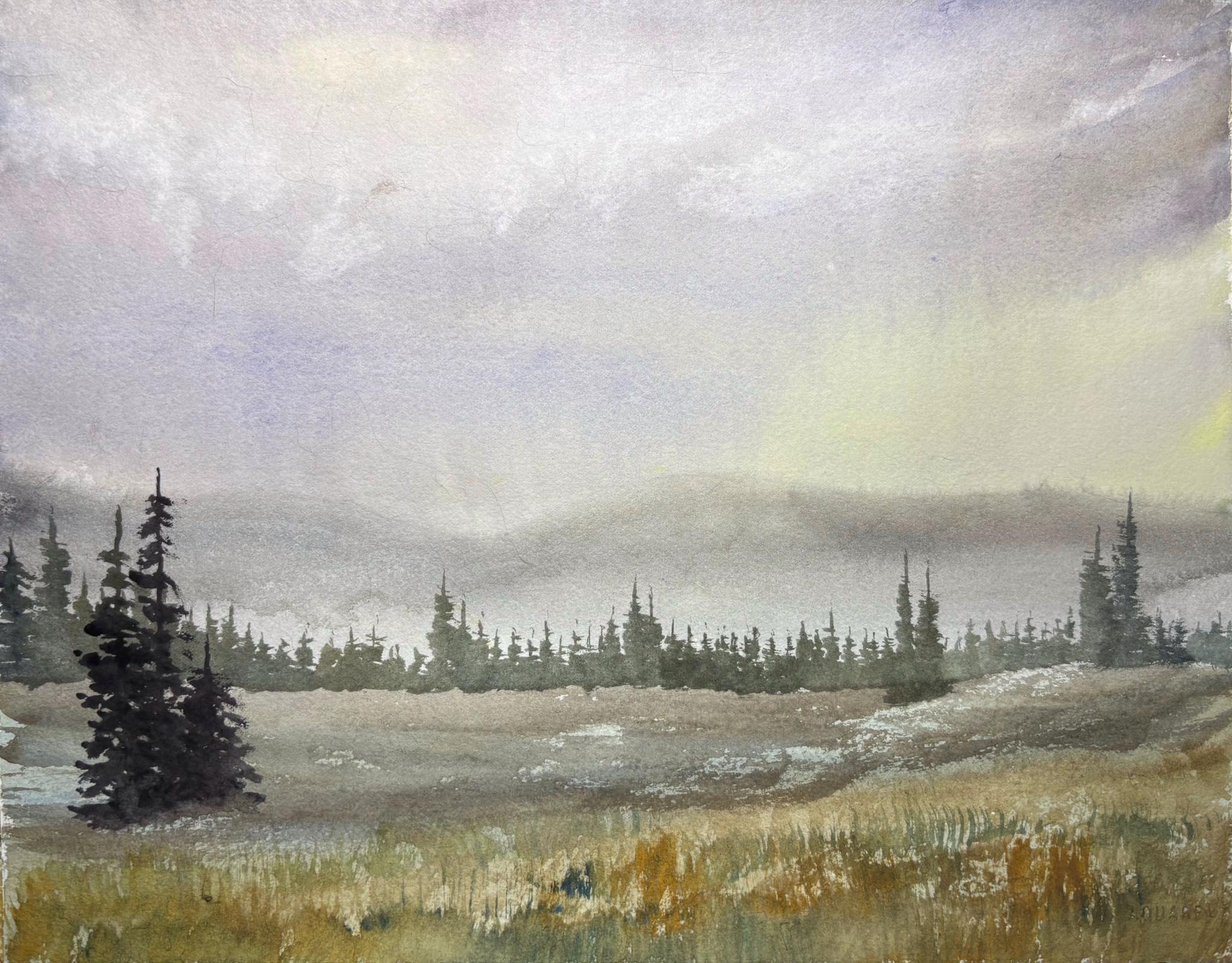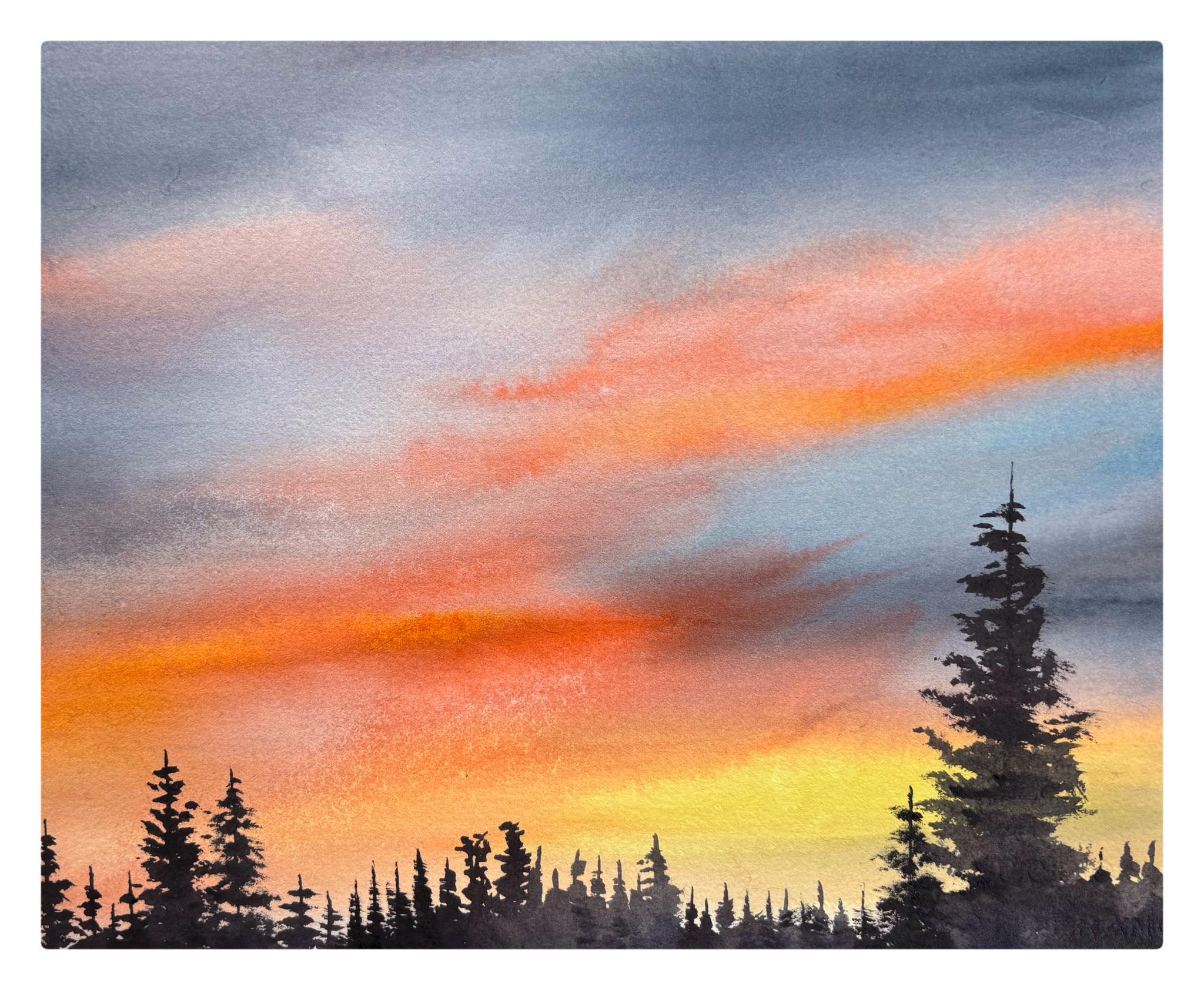 Sunset, Yukon River Valley.. Watercolour on paper, 11×14 inches.