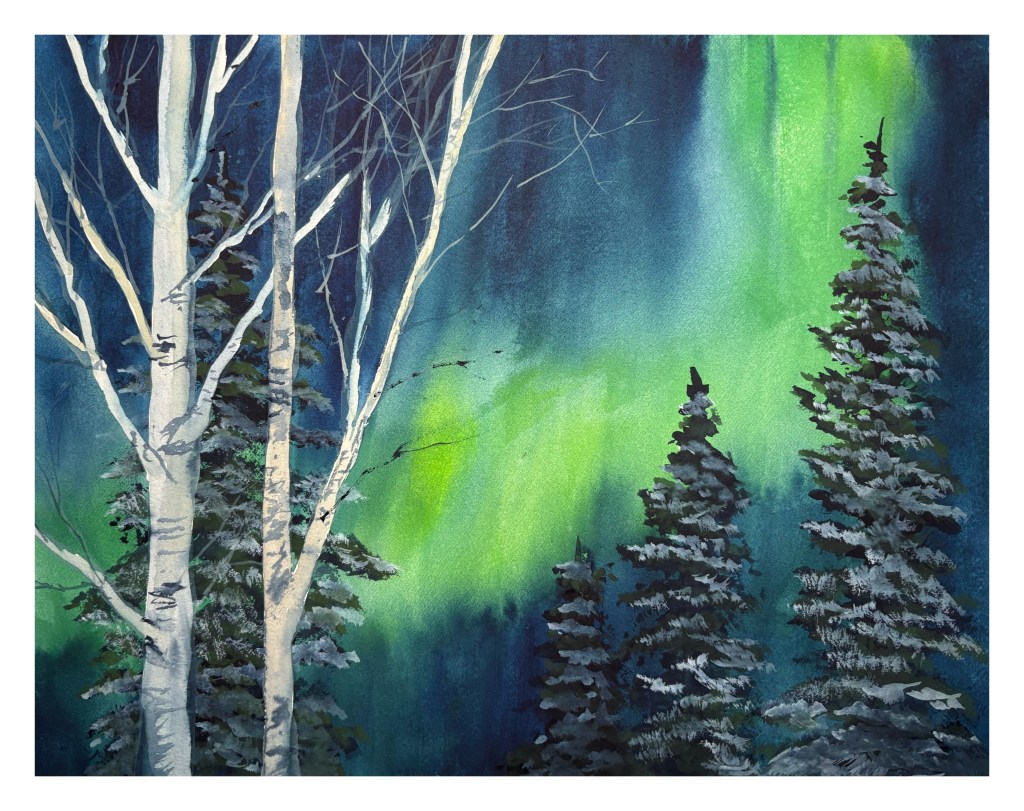 Northern lights. Watercolour on paper, 11 x 14 inches.