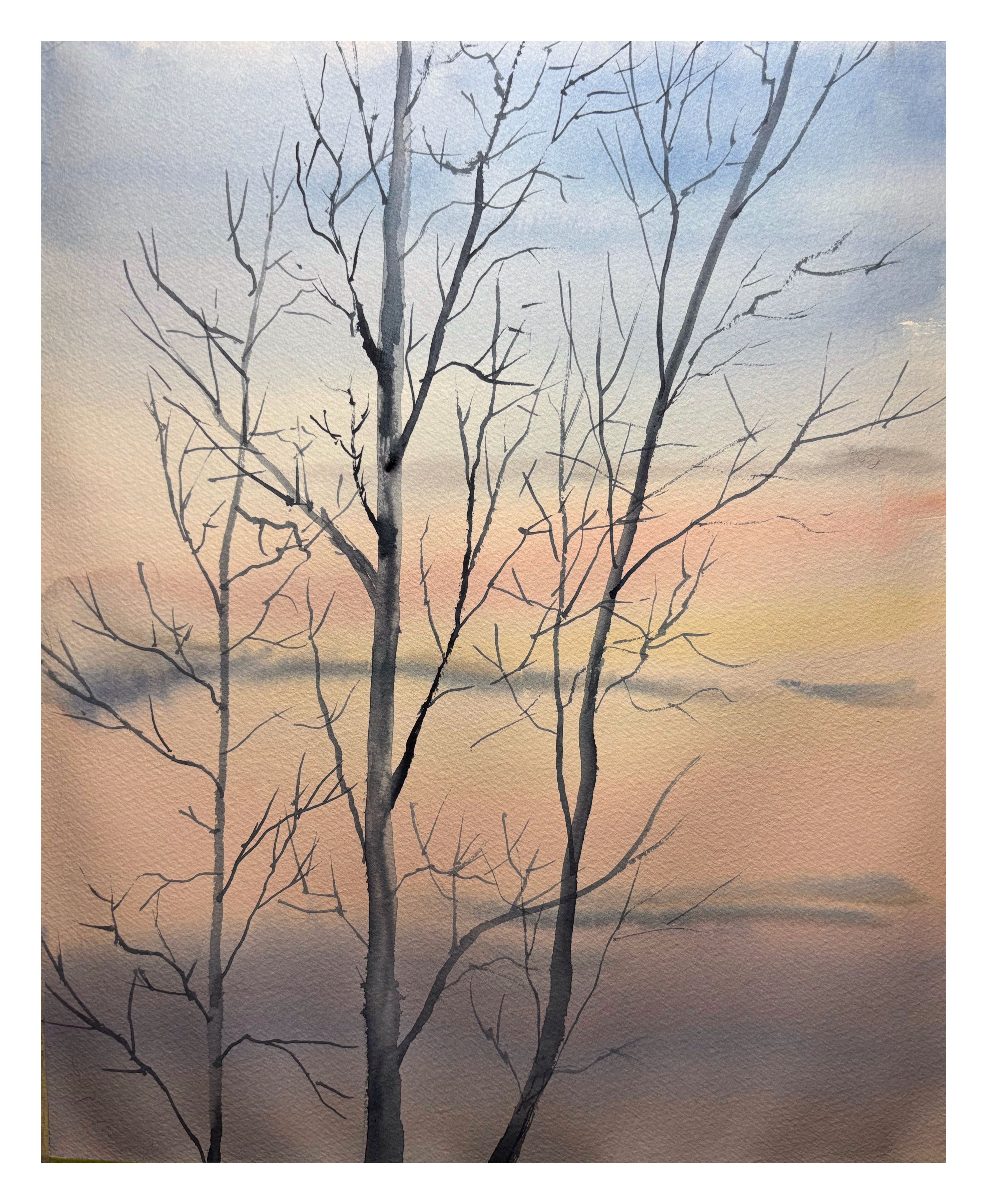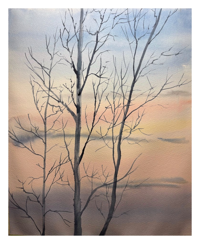Morning poplars. Watercolour on paper, 11×14 inches.