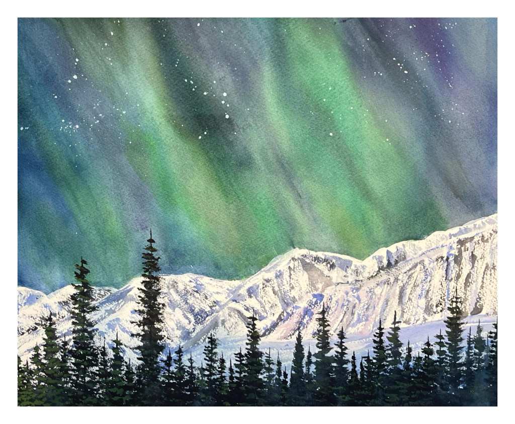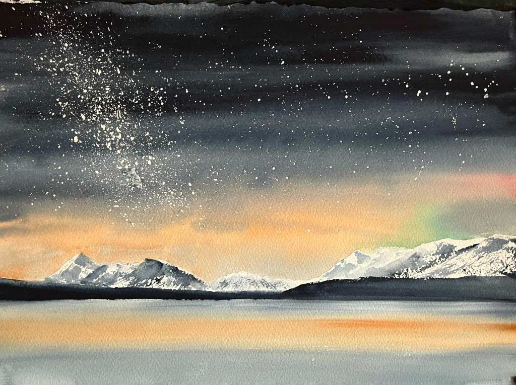 Milky Way over Kluane Lake. Watercolour on paper, 11×14 inches (private collection.)