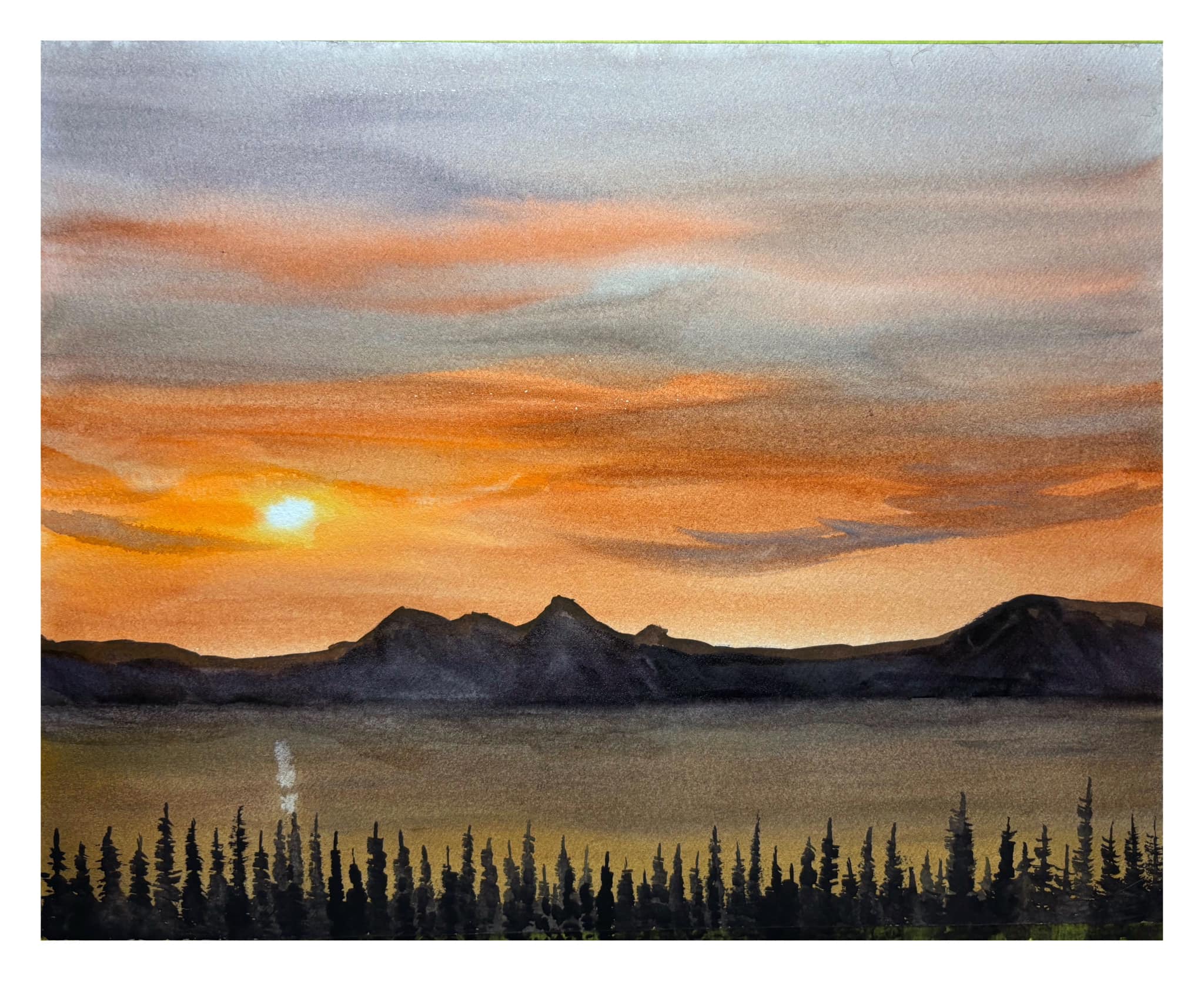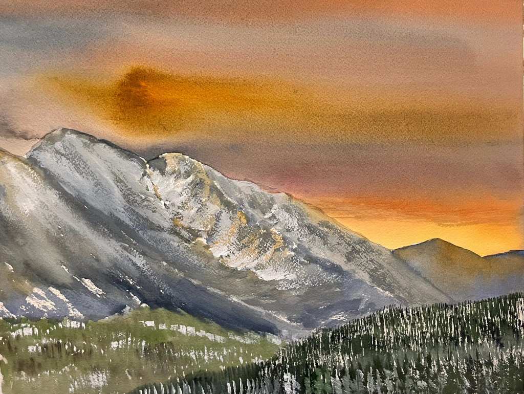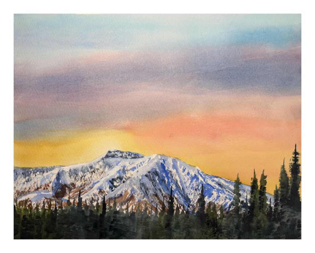 Grey Mountain sunrise. Watercolour on paper, 11×14 inches.