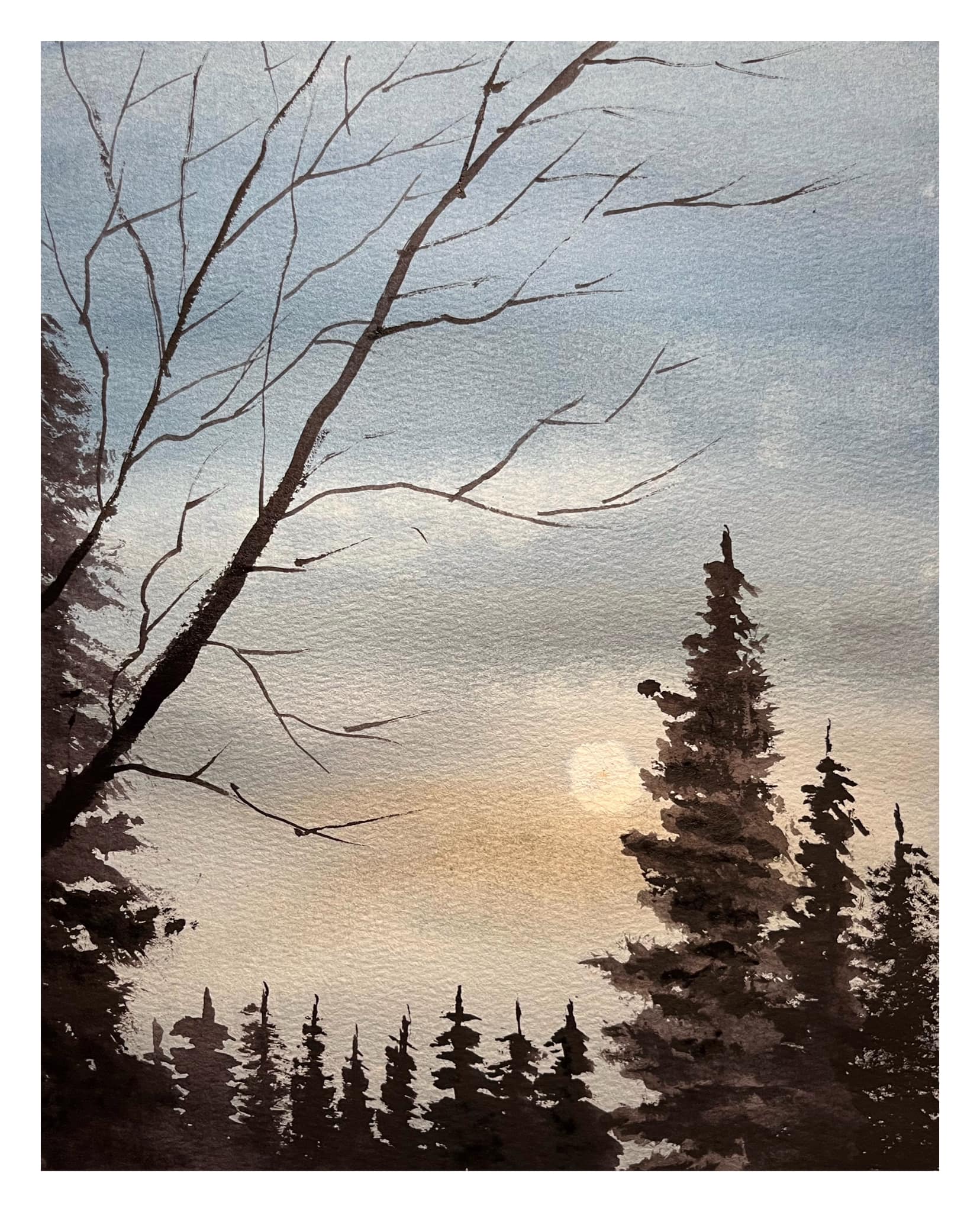 Moonlit trees. Watercolour on paper, 11×14 inches. (currently available at Yukon Artists @ Work gallery.)