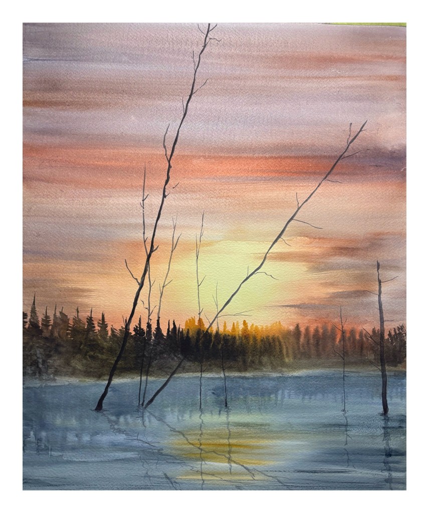 Sunrise, Yukon River. Watercolour on paper, 11×15 inches (private collection).