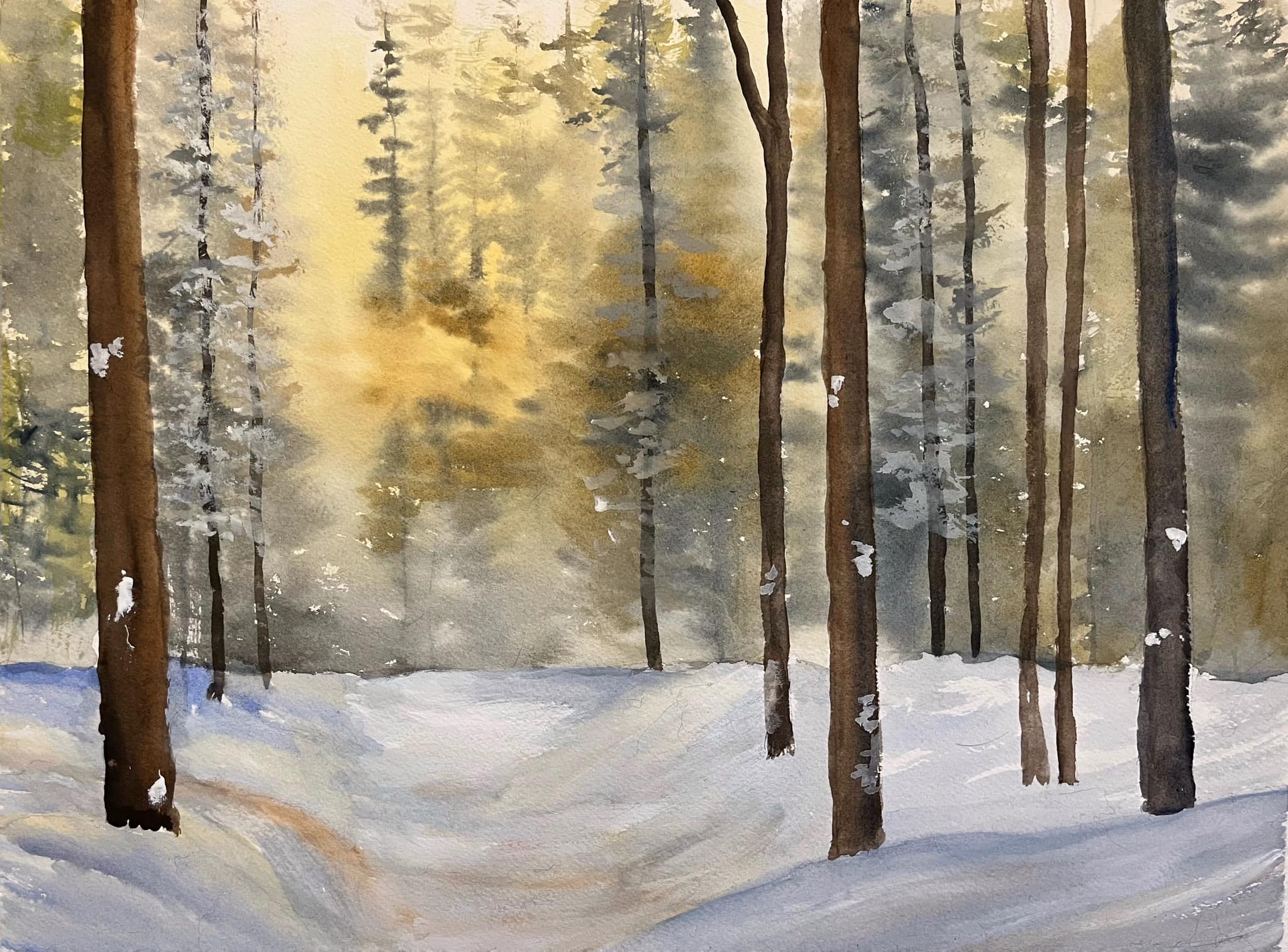 Winter sunrise. Watercolour on paper, 11×14 inches. (currently available at Yukon Artists @ Work gallery.)