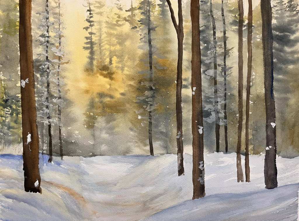 Winter Spruces. Watercolour on paper, 8×10 inches (private collection).
